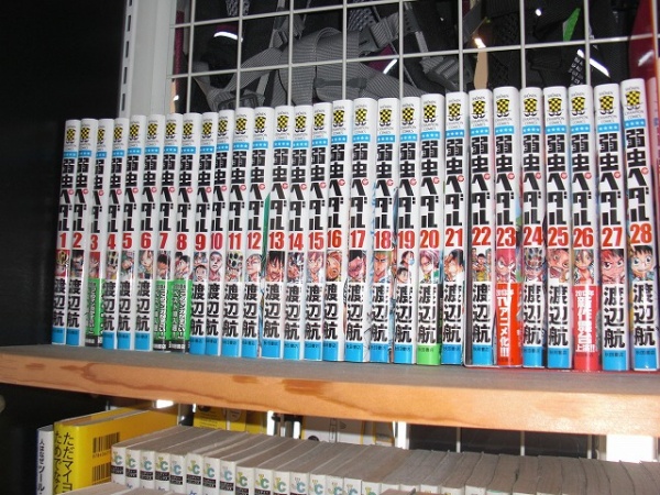 さて、いつの間にか略称になっていた店ディスですが、4回目はマンガにしてみました。自転車屋さんらしく(?)ロードレースや競輪のマンガがいくつか置いてあるわけですが、10月からアニメもスタートするということで今回は弱虫ペダルの写真を載せています。自転車競技部に所属する高校生のロードレースやら友情やら何やらを描いたマンガです。以前、舞台化された映像を見ましたが、これがまた熱い愉快な素晴らしい出来でした。マンガも舞台も面白いのでおススメです。ちなみに、私は最近まで知らなかったんですが作者は長崎県のご出身とのこと。ご自身もロードレーサーに乗っていらっしゃるみたいです。自転車人口が少ない長崎県から出た人がアニメ化するくらいの人気自転車マンガを描くってスゴイですよね。これはもう長崎県の人もたくさんロードレーサーに乗りなさいという流れがきているに違いありません。きっと、おそらく、多分・・・。