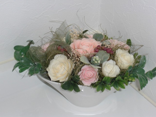 店内数か所に置いている花の置物。これは友人が作ってくれた石鹸のカービングという彫り物。数種類の石鹸をナイフで削り出し花の形に作るものなので香り付きです。趣味で始めたカービング、センスが良くて今では指導者になっています。