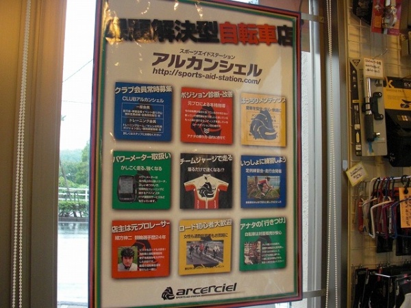 最近登場したディスプレイなので知らない人もいるかもしれません。入口横に貼ってあるアルカンシェルの紹介ポスターです。ちなみに、店内向きと店外向きと背中合わせになってます。デザインは度々登場する、アルカンシェルのチームジャージやロゴをデザインしていただいたデザイナーさんによるものです。いつもありがとうございます。