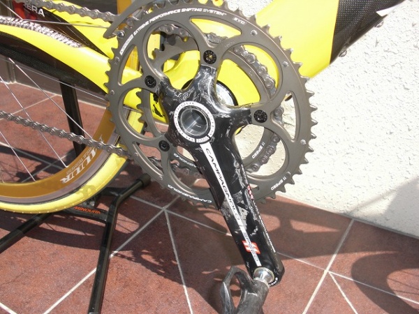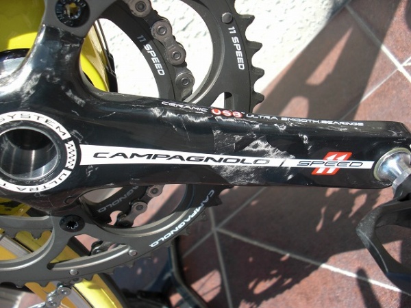 今まではカンパニョーロのケンタウル(10速)を使用しておりました。なぜカンパだったのかといえば、シマノよりもブレーキレバーの引きが軽く、また小さくて握りやすいため手が小さく力が足りない私には丁度良かったこと、フレームがイタリア産カレラ製だったこと、社長から勧められるまま(笑)、その他もろもろの理由からでした。なぜケンタウルだったのかといえば、ブラックレッドというカラーリングが気に入ったから、値段など理由はこちらももろもろありますが、165という長さのクランクが最大の理由でした(ちなみに、一般的には170や175を付けている人が多いらしいです。私は小さいし、それに伴って足も短いので165が丁度いいのです。)。