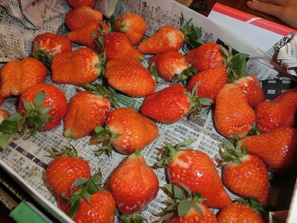 というところで、先日お客様でイチゴ農家の方から素敵なプレゼントをいただいたのでご紹介します。写真のイチゴです(写真はすでに分割してしまった後なんですが、いただいたときは箱にこんもりしていました。)。Mさん、ありがとうございました。